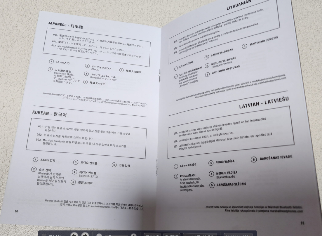 2. 이 제품은 유럽 내수용입니다. 그래서 중국에서 오는데요 짝퉁 걱정이 있었지만, 와서 마샬 블루투스 앱이랑 연동이 잘 되는것으로 보아 짝퉁은 아니였습니다. 유럽 내수용이라 돼지코라 불리는 어답터가 사용은 가능하지만 약간 헐거워서 구매업체에서 한국형 어답터와 옥스선을 동봉을 해주었습니다. 그게 너무 고맙고, 실용적이었습니다.